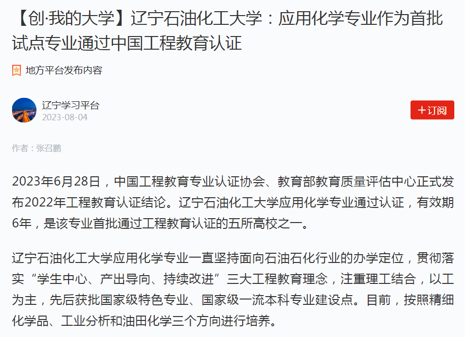 编者按:近日,学习强国辽宁学习平台对我校应用化学专业作为首批试点专业通过中国工程教育认证进行了宣传报道。现将相关报道转载如下: