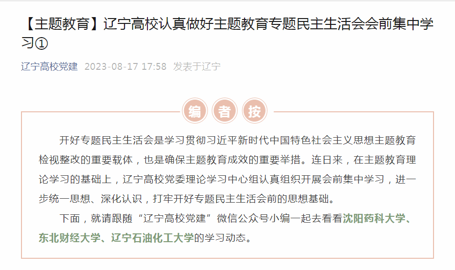 编者按:近日,辽宁高校党建微信公众号对辽宁高校党委理论学习中心组认真组织开展会前集中学习,进一步统一思想、深化认识,打牢开好专题民主生活会前的思想基础进行了宣传,其中对我校党委理论学习中心组举行专题民主生活会会前集体学习研讨作了报道。现将相关报道转载如下: