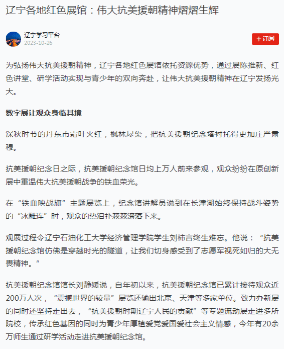 编者按:10月26日,学习强国主平台对辽宁各地红色展馆依托资源优势,通过展陈推新、红色讲堂、研学活动实现与青少年的双向奔赴,让伟大抗美援朝精神在辽宁发扬光大进行了宣传,其中对我校组织学子参观抗美援朝纪念馆作了报道,现将相关报道转载如下: