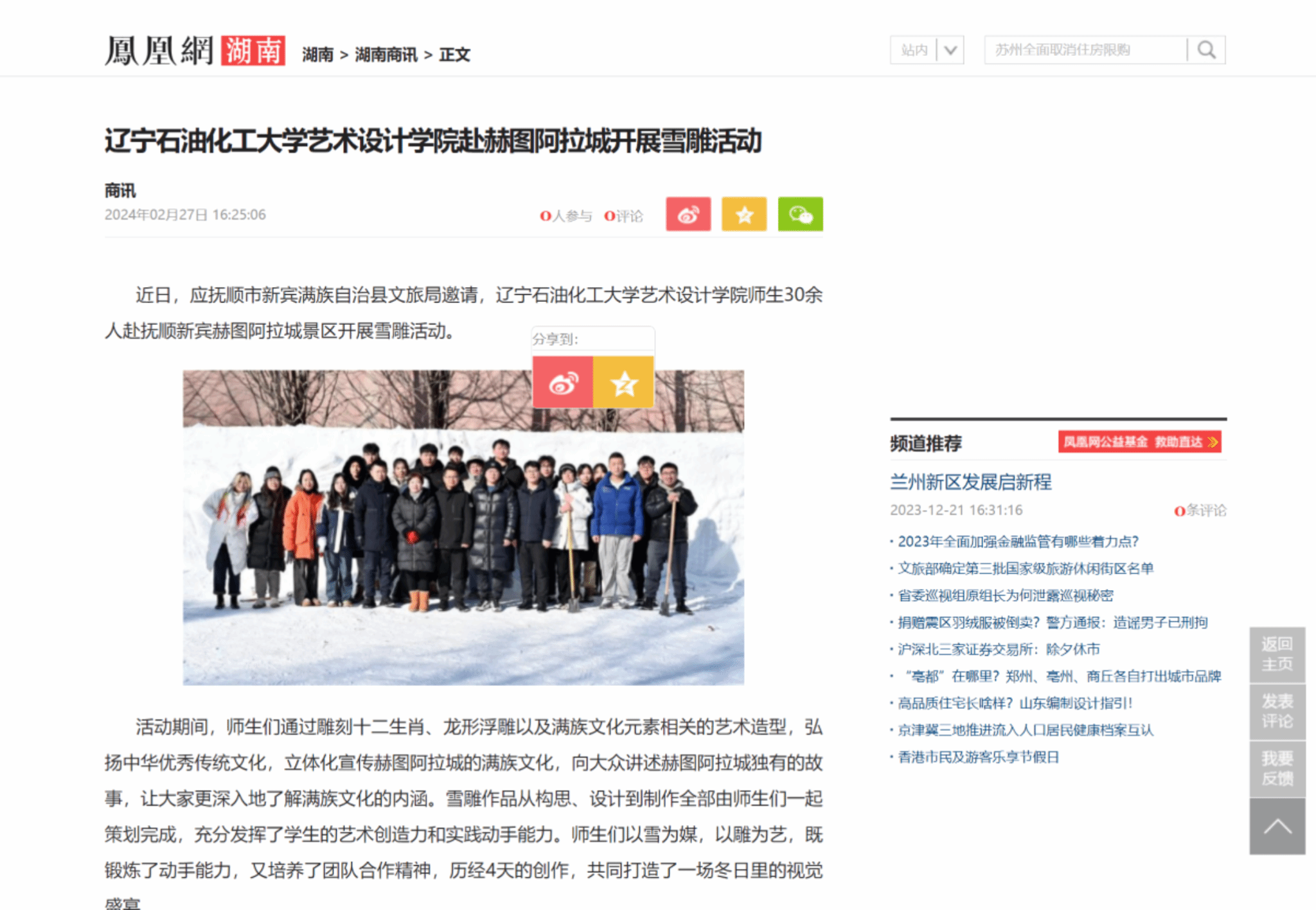 编者按:近日,凤凰网、人民日报客户端·人民号、辽宁日报·辽望号、中国大学生网对我校艺术设计学院师生30余人应抚顺市新宾满族自治县文旅局邀请,赴抚顺新宾赫图阿拉城景区开展雪雕活动进行了宣传报道。现将相关报道转载如下: