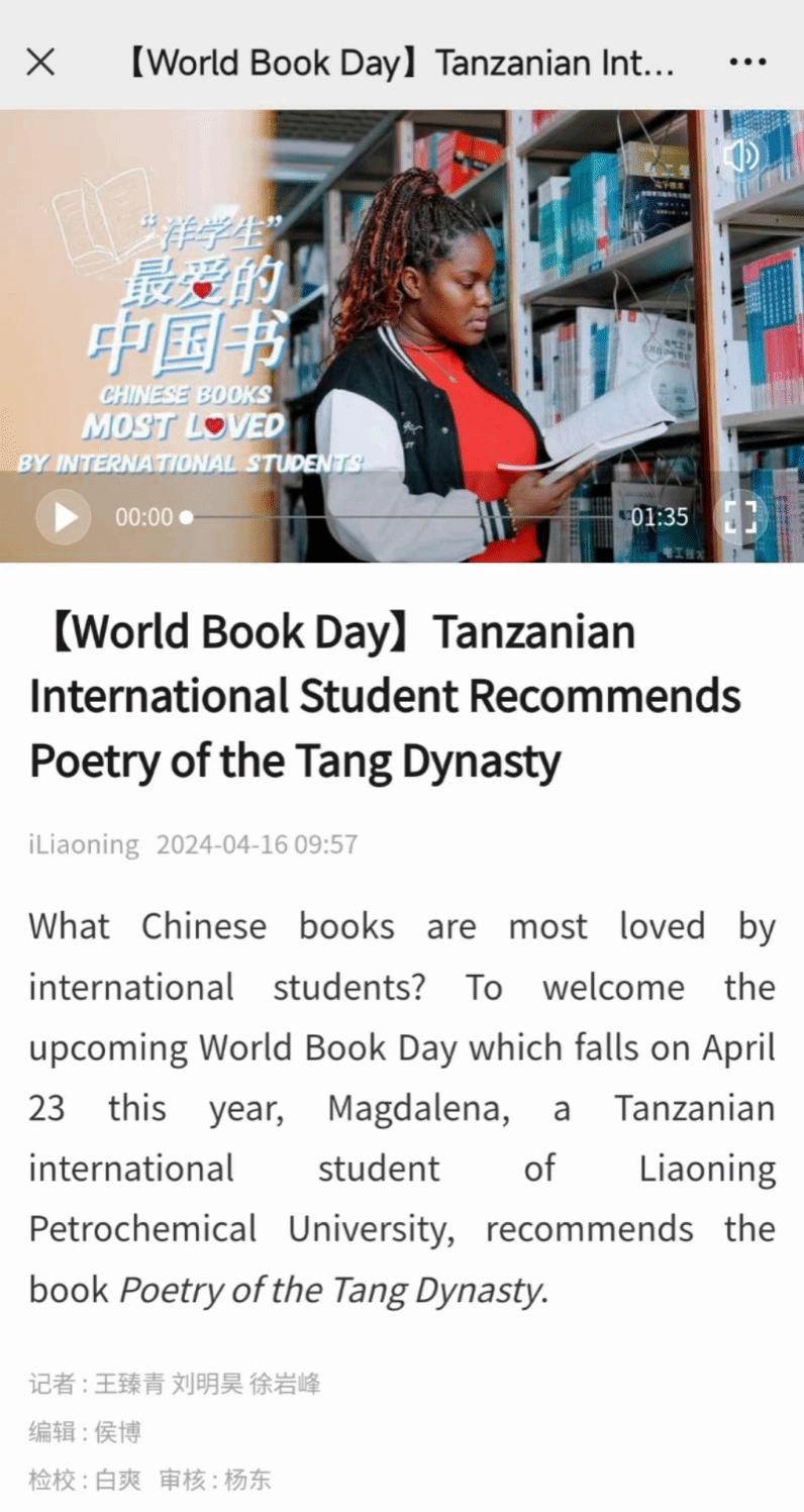 编者按:4月16日,辽宁日报·辽望号以【World Book Day】Tanzanian International Student Recommends Poetry of the Tang Dynasty为题,对我校留学生参加世界读书日,辽宁省读书节,洋学生最爱的中国书评选活动,诵读唐诗《游子吟》进行了宣传报道。现将相关报道转载如下: