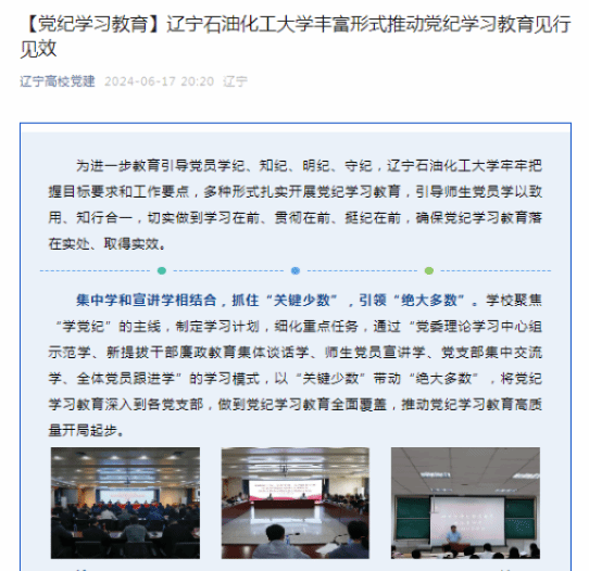 编者按:6月17日,辽宁高校党建微信公众号对我校牢牢把握目标要求和工作要点,多种形式扎实开展党纪学习教育,引导师生党员学以致用、知行合一,切实做到学习在前、贯彻在前、挺纪在前,确保党纪学习教育落在实处、取得实效进行了宣传报道。现将相关报道转载如下: