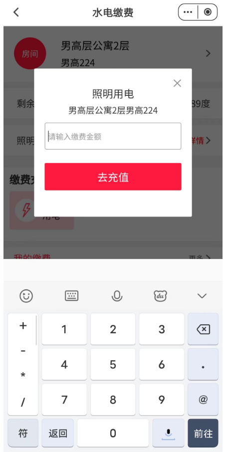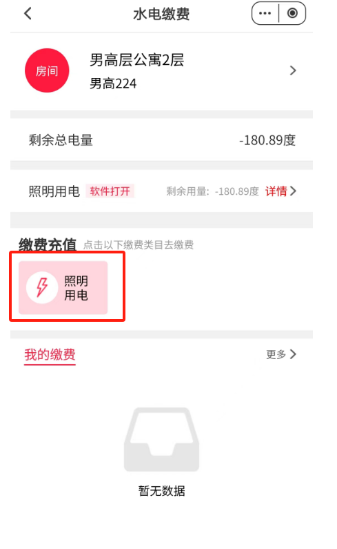 3.“剩余总电量”为当前电量(负数即为欠费), 充值电费点击“缴费充值下”的“照明用电”。
